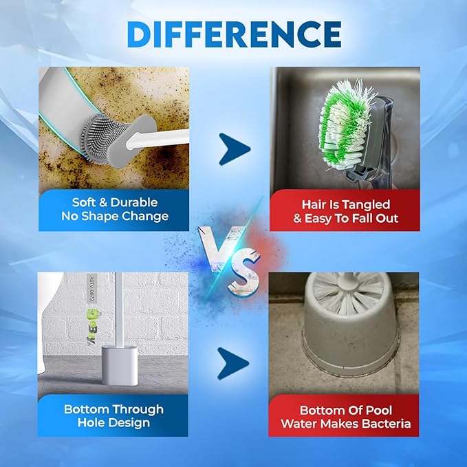 Silicone Toilet Brushes & Holders Set – Pack of 4 Wall Mounted Toilet Bowl Brushes White – Long Non-Slip Handle, Flexible Bristles for Easy Cleaning – Modern Toilet Scrubber Brush