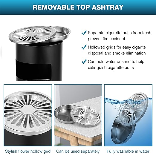 - 【Practical Dual Purpose Design】Our floor standing commercial trash can with lid is a practical combination of ash urn and waste bin, offers an easy disposal of cigarettes and trash at one location. Furthermore, the removable top tray can be used separately on anywhere you need, adding convenience.