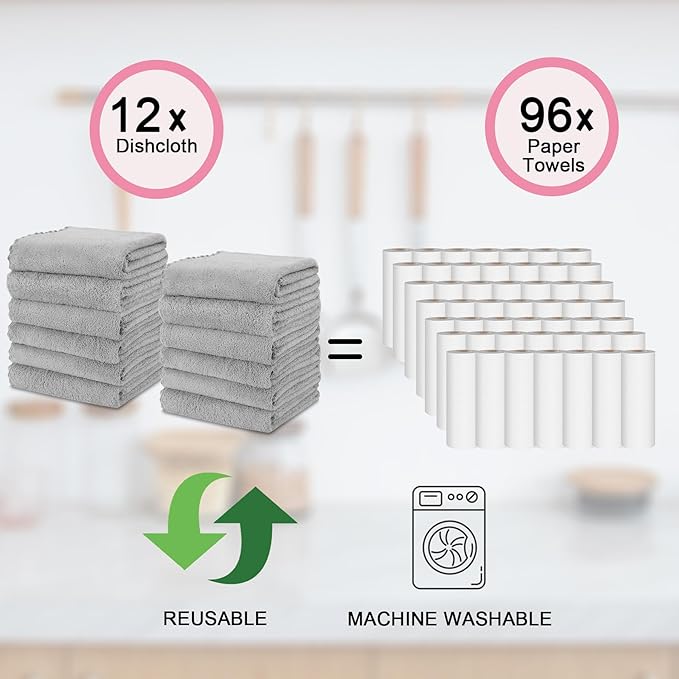 kimteny Kitchen Cloth Dish Towels, 13x28 Inches Premium Dishcloths, Super Absorbent Coral Velvet Microfiber Cleaning Cloths, Fast Drying Rags for Washing Dishes (13x28-12 Pack, Grey)