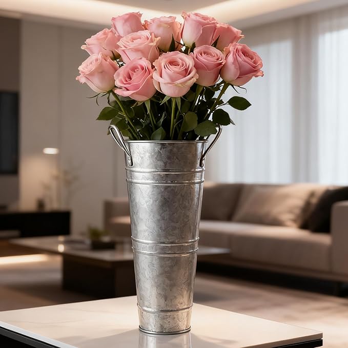 - RUSTIC BUCKET - Our galvanized flower bucket combines the timeless appeal of rustic aesthetics with a touch of modern elegance. The galvanized finish add a farmhouse French flair that effortlessly complements various decor styles.