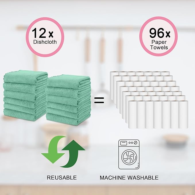 kimteny Kitchen Cloth Dish Towels, 13x28 Inches Premium Dishcloths, Super Absorbent Coral Velvet Microfiber Cleaning Cloths, Fast Drying Rags for Washing Dishes (13x28-12 Pack, Green)