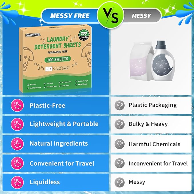- TRAVEL-FRIENDLY CONVENIENCE: Our ultra-convenient laundry detergent sheets, are your ideal travel companion. These revolutionary sheets are meticulously designed to cater to your wanderlust, dissolving rapidly and efficiently, all while being exceptionally space-efficient. Regardless of your destination, experience the luxury of well-cleaned clothes without the bulk of traditional detergents.