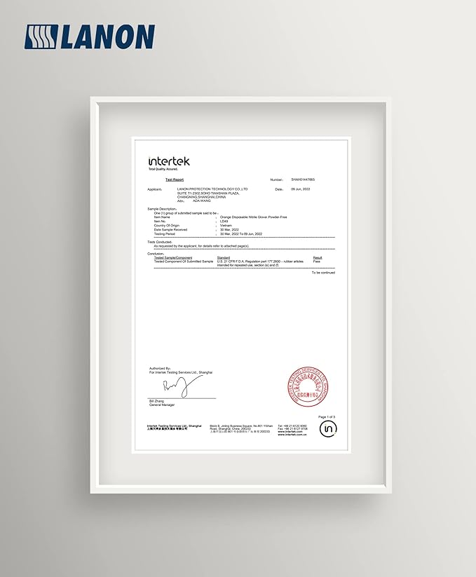 - Next-level Performance - LANON disposable nitrile gloves for hand protection are tested to meet the F.D.A 21 C.F.R, suitable for contact with all food types, EU Certificated, CAT III, with Standards EN ISO 374-1:2016+A1:2018 / Type B, EN 374-4:2013, EN ISO 374-5:2016, and have an AQL of 4.0.