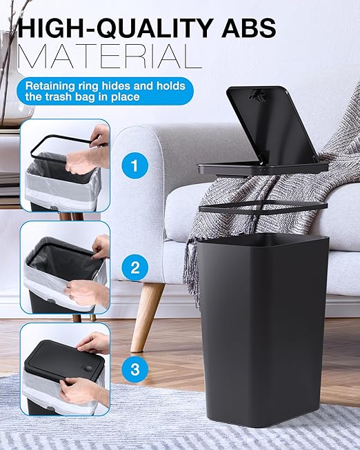 - Odor Control & Pet-Proof: The trash can lid locks in odors tightly, saying goodbye to those dirty and unpleasant smells, preventing trash from overflowing and falling out, and ensuring that the indoor space always has fresh air. Additionally, the trash can with lid prevents pets from rummaging through the garbage