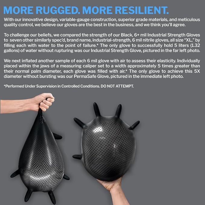 - TRUE INDUSTRIAL GRADE: While most “Industrial” gloves are merely thicker versions of a brand’s standard gloves, PermaSafe Gloves were specifically conceived for tradespeople who work with their hands for a living. Product from the highest grade nitrile and engineered to take on the very toughest tasks, they incorporate unique design elements that ensure they’re as durable as advertised, while adding comfort, performance and productivity-enhancing features that no other glove can match.