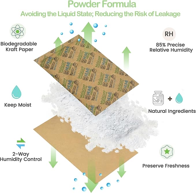 - 【Packed with Kraft Paper】: Humidity Control Packet is packed with environmentally friendly and biodegradable kraft paper, ensuring safety and harmlessness. Kraft paper packaging material is not only biodegradable and recyclable but also offers excellent tear resistance, breathability, and dust-free properties. Buy using humidity pack you don't have to worry about adding water to the box or using a hygrometer anymore. Your box or jars naturally keeps its humidity at 85%RH.