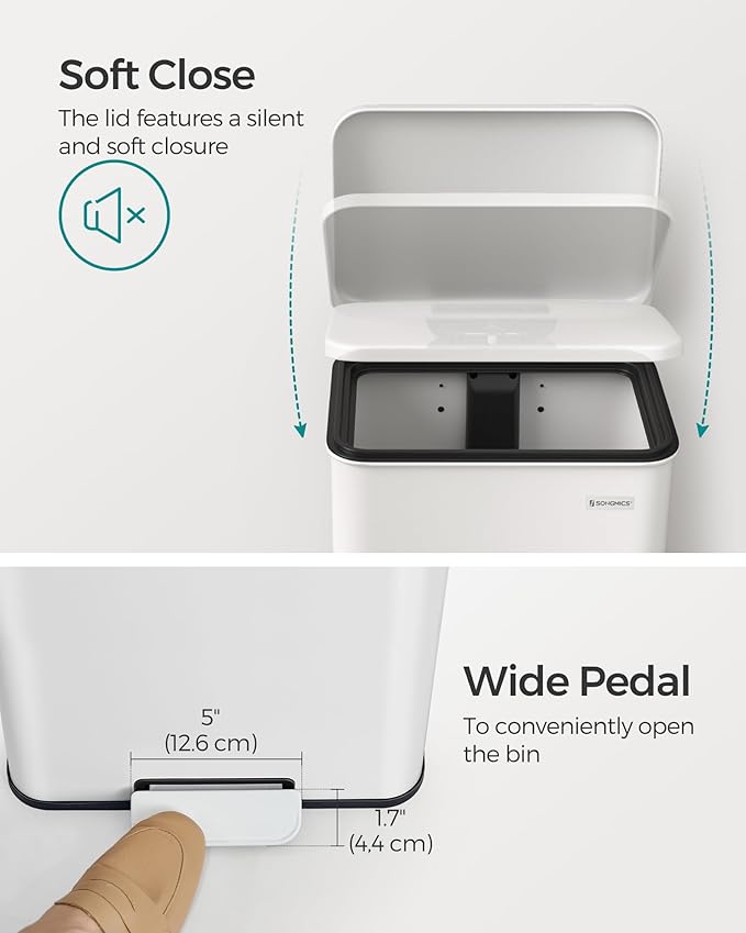 - [Soft Closure] The trash can features a slow, silent, and soft-close lid. No more dealing with loud clangs after use—enjoy a quieter and smoother disposal experience