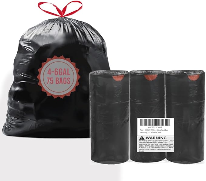 4-6 Gallon Trash Bags Drawstring, 75 Count Bulk, Black & Unscented Multi-purpose Garbage Bags for Business Home Bathroom Kitchen Commercial and Industrial