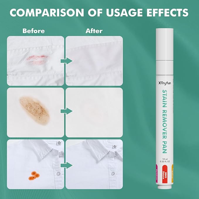 - PORTABLE & TRAVEL FRIENDLY: Pen-like design, XTryfun stain remover pen fit in your pocket that is your portable and reliable solution for on-the-go stain removal. With its effortless usability, you can swiftly tackle any stains that come your way. The secure cap ensures the liquid stays safely contained until needed, eliminating worries of spillage or leakage, fits neatly into briefcases, purses, kitchen, or car.