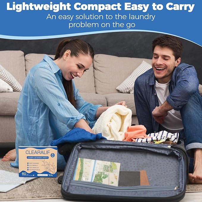 - Portability:Laundry detergent sheets are thin, paper-like sheets. The packaging is so lightweight and compact, making them a great choice for travelers or people with limited storage. You can easily carry them to the in your luggage or laundromat, while traveling, or when visiting friends without adding much weight or taking up space.(Up to 60 Loads)