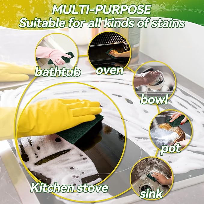- Suitable for any scene: Including kitchenware, sink, furniture, bathroom floor, bathtub and so on. Oil stains, limescale can be solved, the scrub pad is especially good at removing oil stains, after adding detergent, it can easily help you solve the trouble of cleaning oil stains and limescale on the surface of the oven, barbecue grill, it's more durable than traditional sponges, with a greater cleaning strength and more powerful, it can be used in place of steel wire balls.