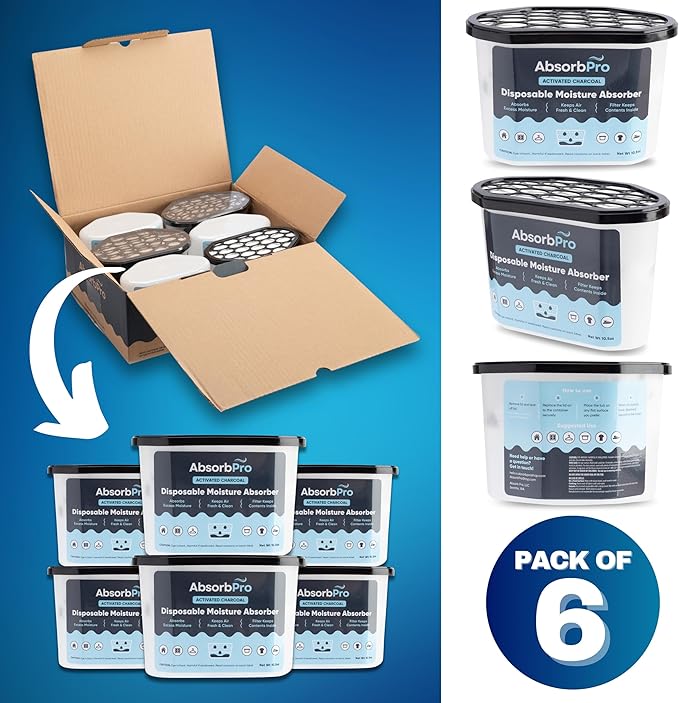 Moisture Absorber Tub with Activated Charcoal - 6-Pack - 10.5 oz Disposable Odor Eliminator Box & Dehumidifier for Garage, Home, Kitchen, Bedroom, Bathroom, Closet, Cars, and Boats