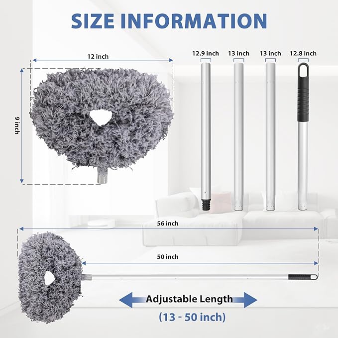 - Adjustable Length: The design of the telescopic pole on the ceiling fan duster allows for easy length adjustment from approximately 13 to 50 inch, without requiring a chair or ladder, making it convenient and safe to clean.