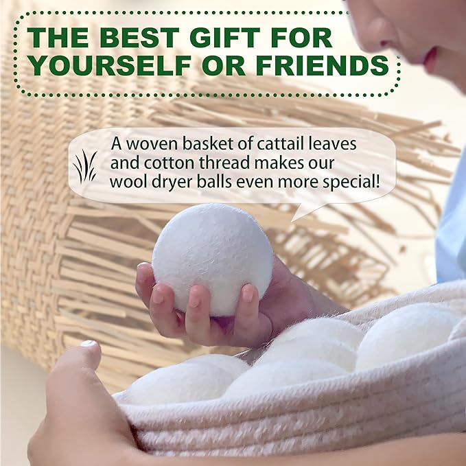 • Pure New Zealand Wool, Naturally Crafted: Made through a meticulous yet chemical-free process of cleaning, carding, hand-rolling, felting, and sun-drying, our 100% natural wool dryer balls preserve the fiber's integrity while delivering unmatched softness and sustainable fabric care. Each ball undergoes careful quality inspection before being nestled in its basket.