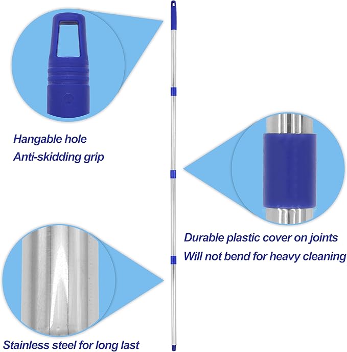 - 4 Section Pole: strong and durable stainless steel with plastic cover on joints, will not bend for heavy cleaning. screw on installation. 1 section=1.3 ft.; 2 section installed= 2.6 ft.; 3 section installed= 3.9 ft.; 4 section installed= 5.2 ft.