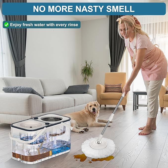- FRESH & CLEANER HOME: We want our home to be clean and fresh for us and our pets. Our RinseWise spin mop, tailored for homes with pet dogs. Traditional mops can spread the unpleasant odor of dog urine by repeatedly cleaning in dirty water, but not ours. Our innovative design ensures the separation of foul-smelling water, leaving your floors truly fresh and clean. Safe around pets and children, say goodbye to lingering odors with ease.