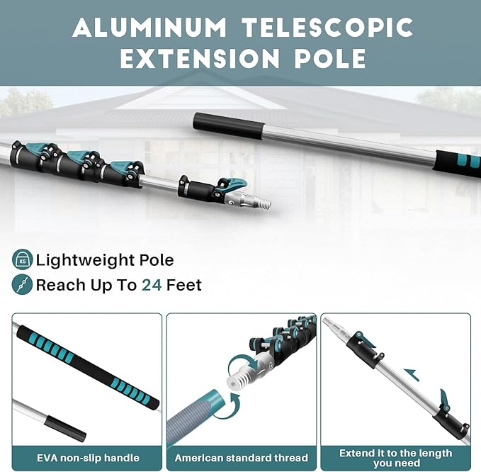 30 Foot High Reach Duster Kit with 6-24FT Extension Pole High Ceiling Dusting and Window Cleaning Kit with Telescopic Pole Window Washer&Squeegee,Cobweb Duster,Fan Duster and Feather Duster