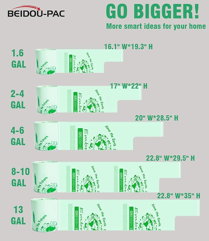 - [KITCHEN COMPOST BIN COMPATIBLE] -- BEIDOU-PAC Compostable Bags, 1.6 gallon (16.1" x 19.3" x 0.62 mils), 125 bags per roll, Total 250 bio bags bulk home compostable and biodegradable are compatible with Countertop Bin a compost system. Our compost trash bags can perfect for 1.6-gallon trash can.
