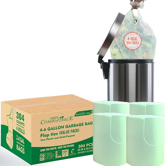4-6 Gallon Flap Tie Compostable Trash Bags, 304 Count, Compost Bags Kitchen Trash Bags, Sturdy Biodegradable Garbage Bags Food Scrap Waste Bags, ASTM D6400, US BPI Certified