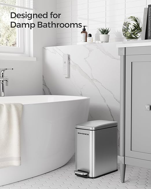 - [Perfect for Damp Bathrooms] Featuring a stainless steel bin and a tightly sealed lid, this small trash can is resistant to rust and water, ensuring a dry interior that’s perfect for use in damp bathrooms