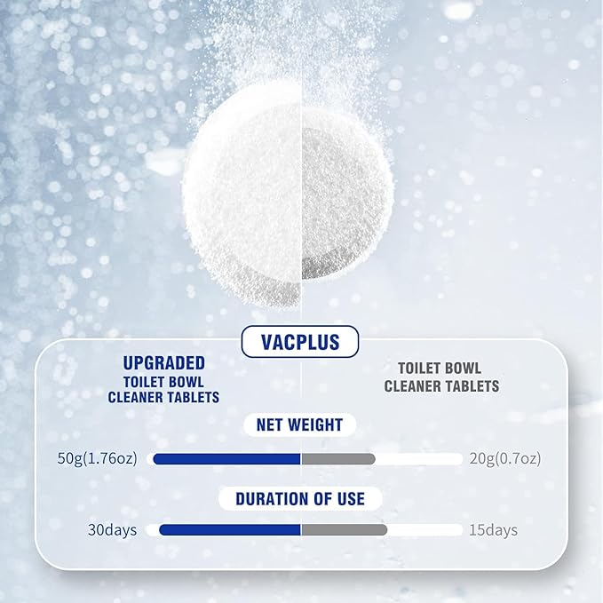 - LASTINGLY CLEAN: With an upgraded capacity of 50g each, a Vacplus toilet cleaner with bleach continuously cleans the toilet for up to 30 days. With 24 packs for replacement use, Vacplus toilet tablets can keep the toilet bowl fresh for more than 24 months.