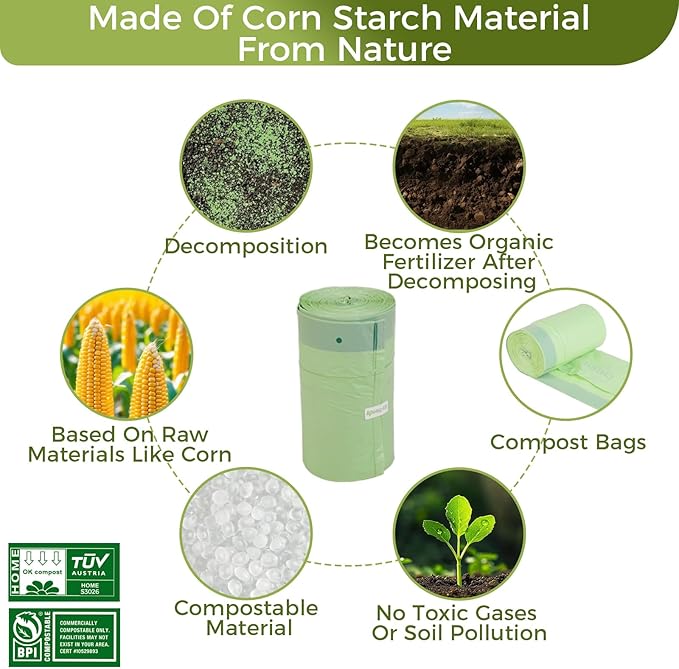 - Certified Reliability: Our compostable bags are BPI Certified, OK COMPOST Certified, and Seedling Certified from TUV, ensuring reliable composting performance.