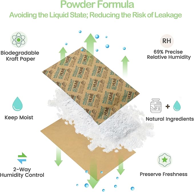 - 【Packed with Kraft Paper】: Humidity Control Packet is packed with environmentally friendly and biodegradable kraft paper, ensuring safety and harmlessness. Kraft paper packaging material is not only biodegradable and recyclable but also offers excellent tear resistance, breathability, and dust-free properties. Buy using humidity pack you don't have to worry about adding water to the box or using a hygrometer anymore. Your box or jars naturally keeps its humidity at 69%RH.