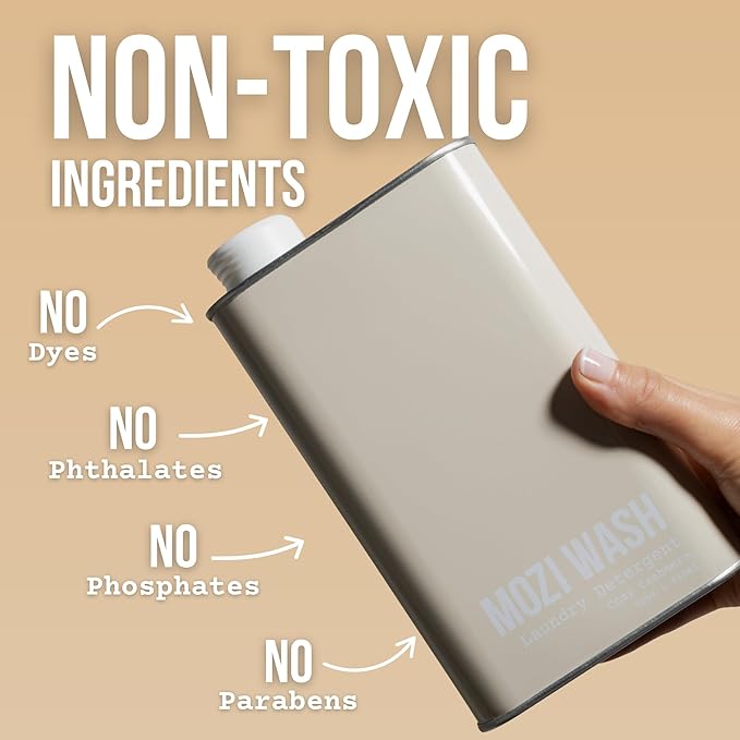 - EARTH FRIENDLY & MIXED IN LOS ANGELES: Crafted with a non toxic, cruelty free formula, Mozi is free from dyes, parabens, and phosphates. Packaged in recyclable metal bottles and made fresh in Los Angeles, it’s eco-friendly laundry detergent that looks as good as it performs.