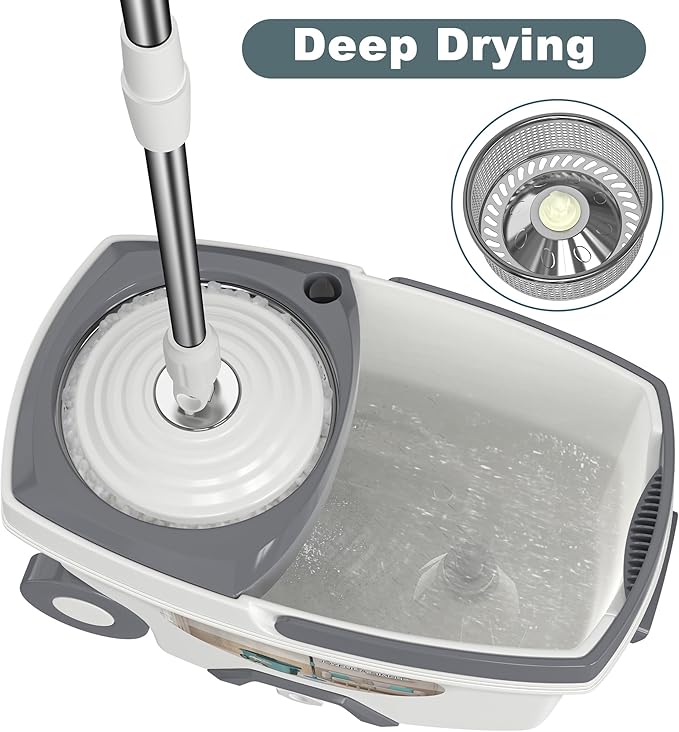 - CONSIDERATE DESIGN - This luxury spin mop system has two wheels , one pull handle, one carry handle, bringing extra comfort to the disabled and people who cannot manage heavy weight. Also have one drainage plug for draining water and one detergent dispenser for dirtier floor