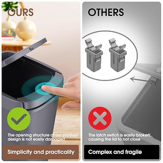 - Press-up lid: The small wastebasket with Pop-up lid, The Press Top Lid makes disposal of the trash easy, Then press the lid to close the bin to hide waste; The lid fixes the garbage bag and prevents the garbage bag from slipping away
