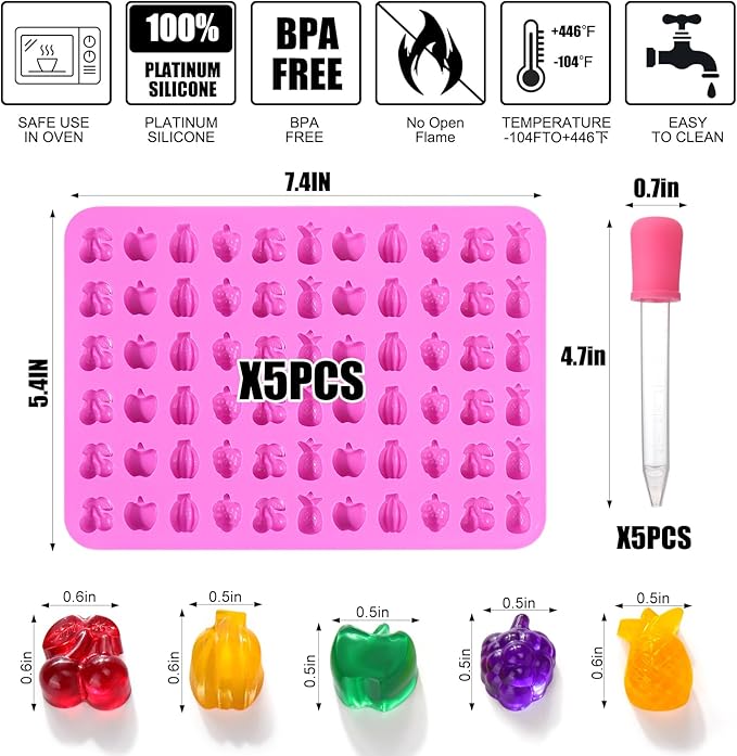 - Silicone fruit molds size: You will get 5Pcs 66-cavity silicone molds with 5pcs droppers, which can make 330 mini fruit shape snalcks at once( pineapple, grape, apple, banana, cherry shape fruit.). The size of easy tray mold is 7.4*5.4 inch, the size of each dropper is 4.7*0.7inch and the size of each candy is 0.6*0.5inch(Suitable mini size for children)
