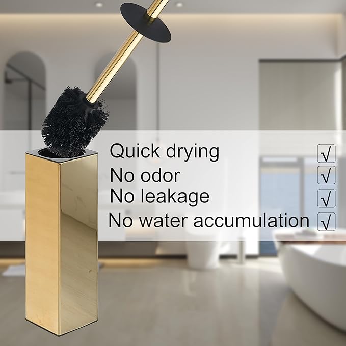 BGL Square Toilet Brush with Holder,Stainless Steel Rubber Painted Toilet Bowl Brush and Holder for Bathroom,2 Cleaner Brush Heads,Gold
