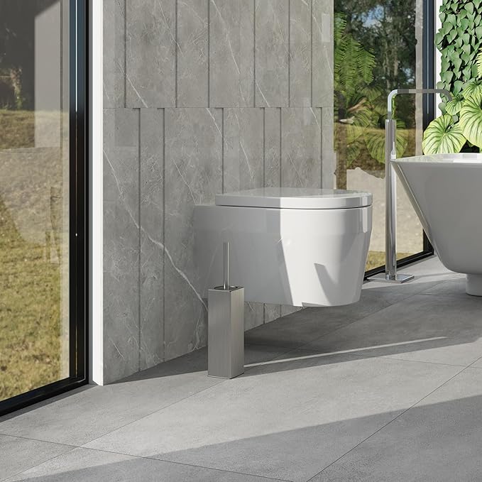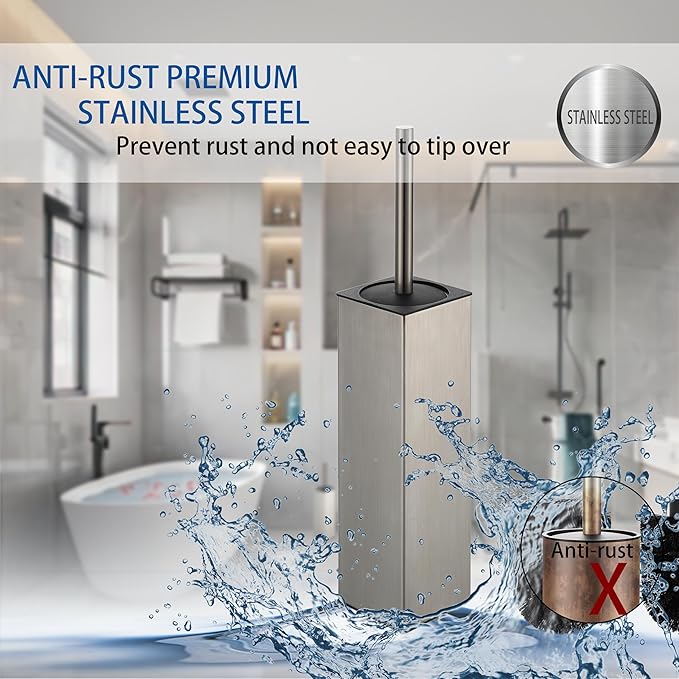 BGL Square Toilet Brush with Holder,Stainless Steel Rubber Painted Toilet Bowl Brush and Holder for Bathroom,2 Cleaner Brush Heads,Brushed Nickel