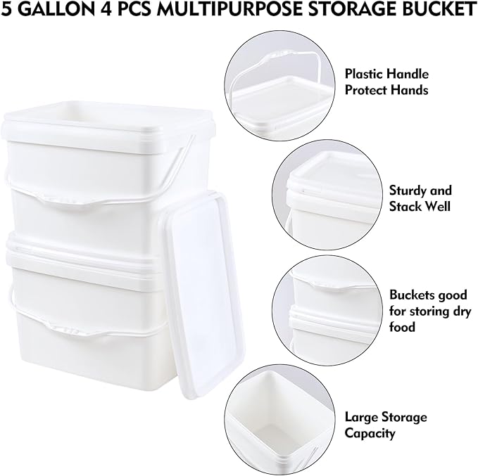 4-Pack 5 Gallon Plastic Rectangular Bucket Pail with Snap Lid, Square Food Bucket Pail Container with Handle, White