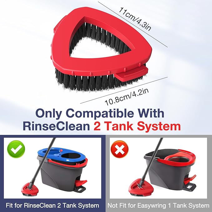 - γHigh Quality Scrubber Brushγ The rinsecean 2-tank system scrubber mop head has 3 rows of high-quality bristles and a unique triangular design that allows it to effectively clean all corners. Our scrubber brush is built to last to clean the stubborn stains, with exceptional durability that ensures it won't wear out over time. NOTE: Not recommended to use on some surfaces which scratched easily like wooden floors.