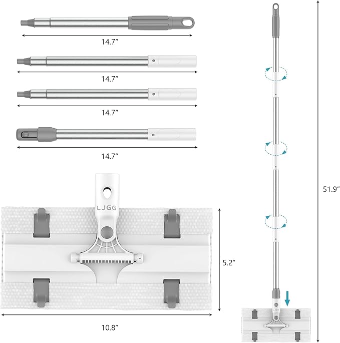 - Sturdy 52" Aluminum Handle — Four-section aluminum handle design, durable and easy to assemble, comfortable length for daily cleaning.