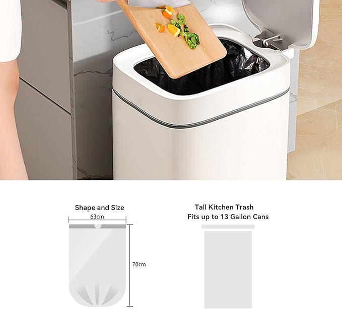 - 5. Each bag measuring 63x70cm and weighing 16.8g per piece, our kitchen trash bags 13 gallon are perfectly sized to fit tightly into standard kitchen trash cans.