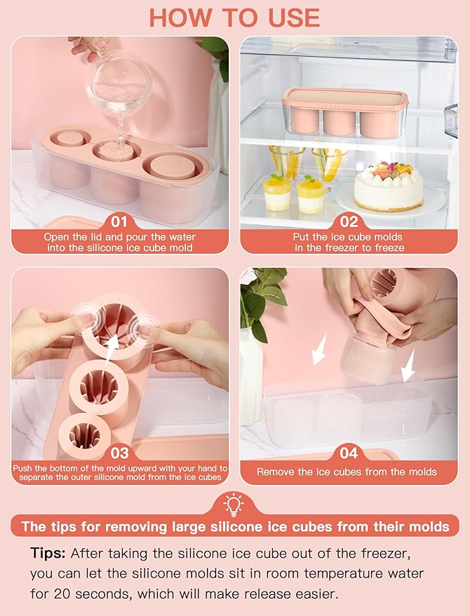 - Easy to Operate - The flexible silicone mold makes it easier to remove the ice cubes.Just peel off the outer mold and squeeze the cap to release your fresh ice. It's super durable, way better than those flimsy plastic trays and easier to clean and store.Perfect for making your favorite chilled drinks!