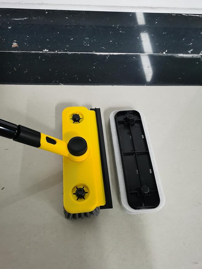 - Functional Cleaning Head: The shower cleaning supplies includes 1 hard-bristled brush, 1 scouring pad and 1 squeegee. The stiff bristle floor scrubber head scrubs the stubborn dirt, the scouring brush cleans the tub, and the rubber squeegee scrapes water