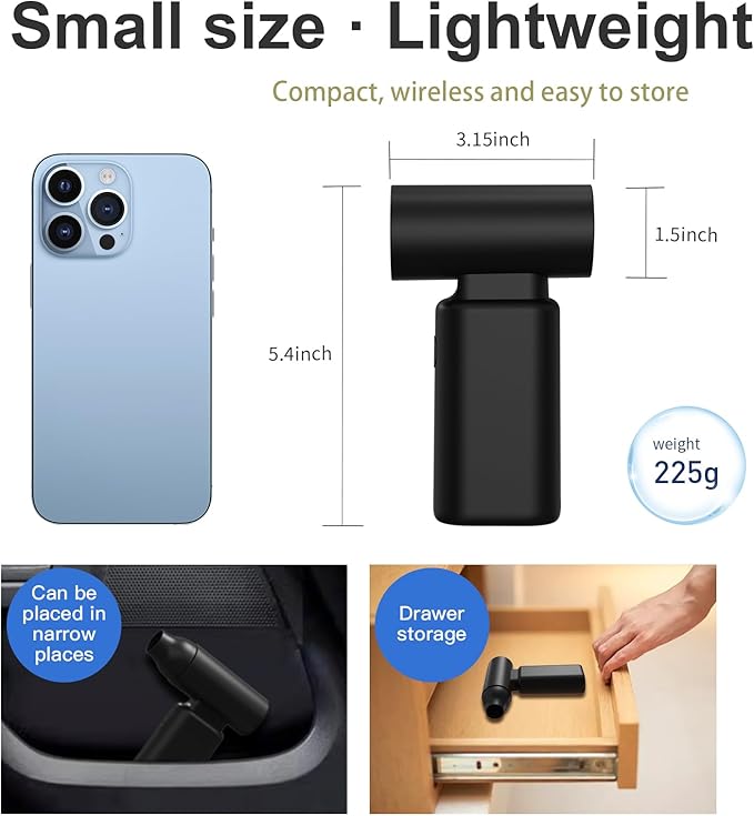 - [Compact and convenient design] Compressed Air Duster weights only 225g and the body size is 3.1 x 1.5 x 5.4 inch. Its compact size makes it easy to carry and store. However, the wind power is strong and the maximum speed can reach 67000RPM, it is a good helper for outdoor, car or home.