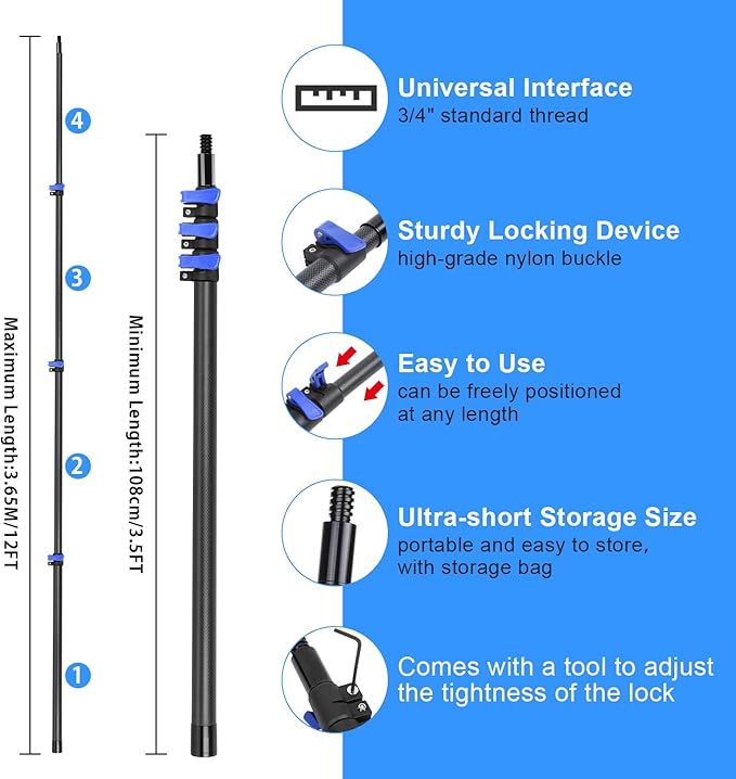 - 【Carbon Fiber Material】Compared with aluminum, carbon fiber has higher strength and rigidity. Our extension rod is made of carbon fiber material, which improves the bending and breaking phenomenon of traditional poles during use. The rust-proof and high-temperature resistant properties of carbon fiber make the pole more reliable and long-lasting.