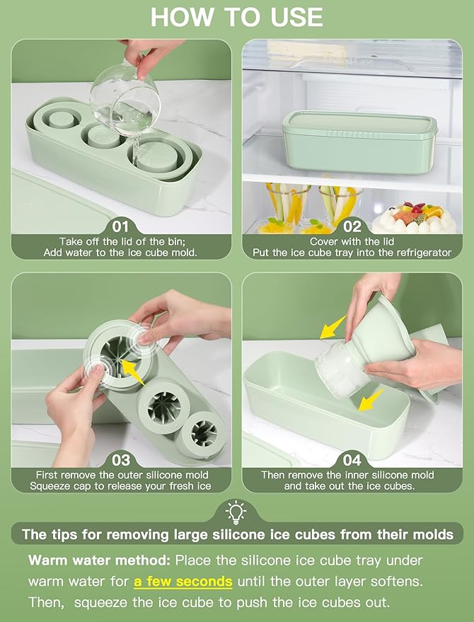 - Easy to Operate - The flexible silicone mold makes it easier to remove the ice cubes.Just peel off the outer mold and squeeze the cap to release your fresh ice. It's super durable, way better than those flimsy plastic trays and easier to clean and store.Perfect for making your favorite chilled drinks!