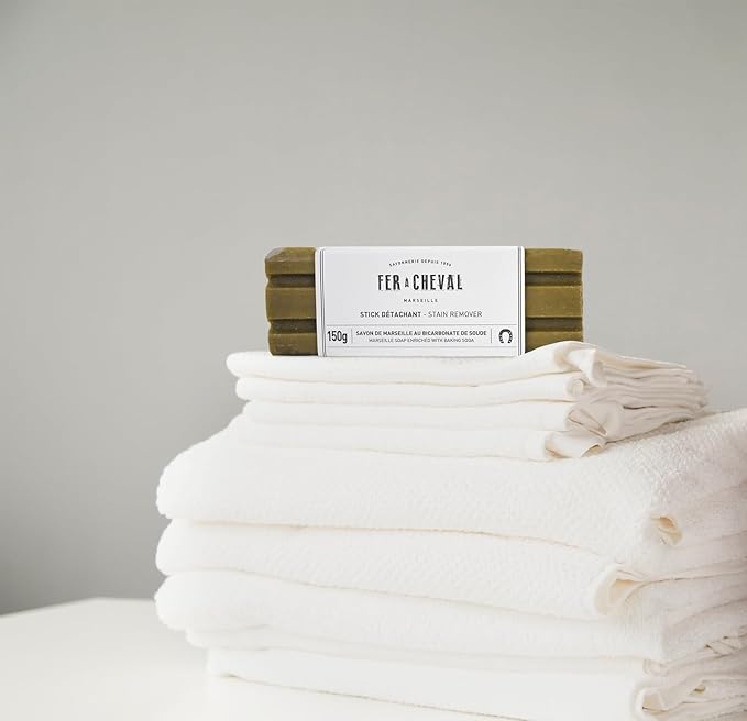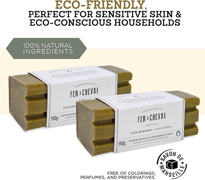 Fer à Cheval Marseille Soap Stain Remover Stick 2 Pack - Natural, Hypoallergenic, Travel-Sized Laundry Solution, 150g/5.29oz (Stick with Baking Soda)