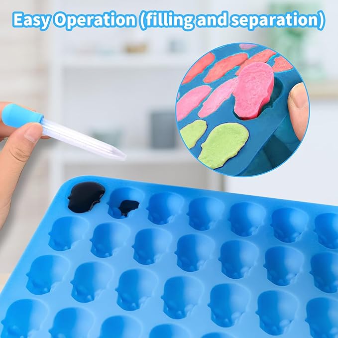 - 80 Cavities: you will get 2 pieces of 40 cavities skull silicone molds (80 cavities in total) and 1 dropper (5ml); each skull mold size: 6.7*6.3*0.4 inches; Each skull cavity size:1.1*0.7*0.4inches.