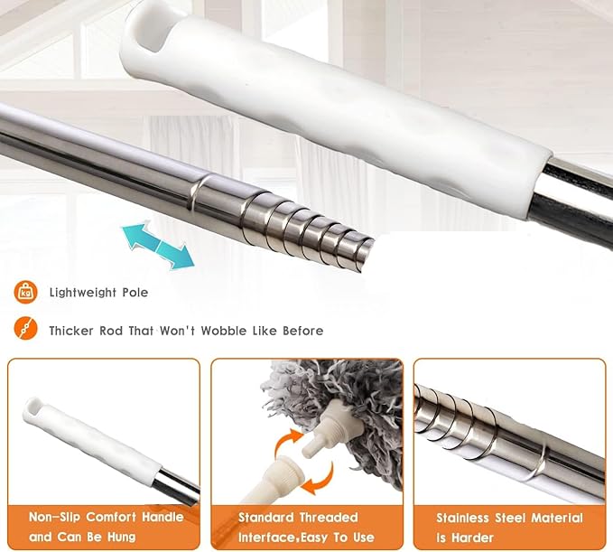 - Efficient Extendable Pole:This long handle duster is extendable up to 85” to reach all places in the house, including ceiling Fans, Window Blinds, Computer Screens, Keyboards, Plant Leaves, Dashboards, Bookshelves,Car Windows,Pets Hair,anywhere narrow or places hard to reach.