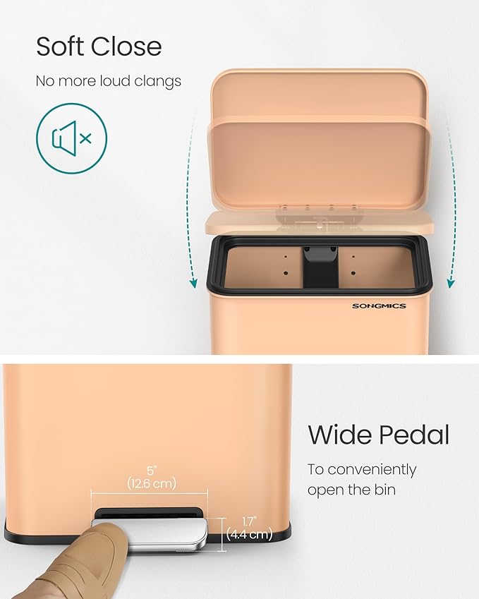 - [Soft Closure] The trash can features a slow, silent, and soft-close lid. No more dealing with loud clangs after use—enjoy a quieter and smoother disposal experience