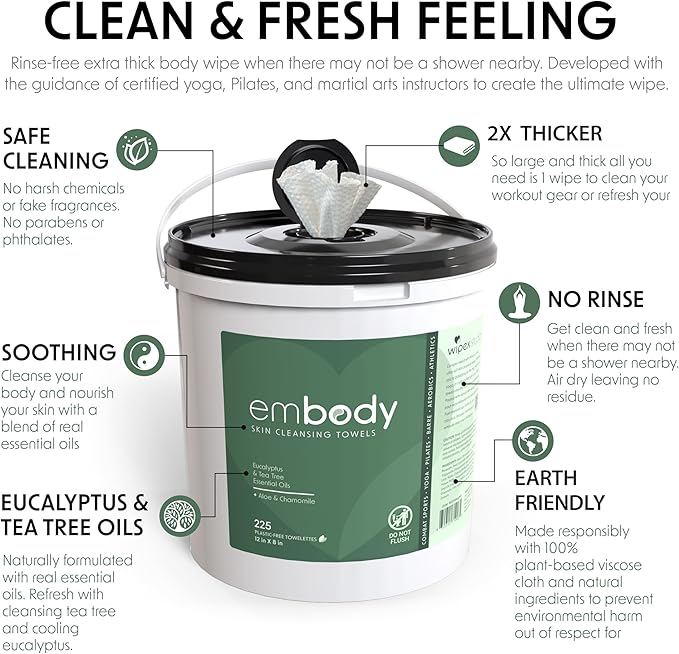 - [Body Wipes] ECONOMICAL: 225 ct 100% Fresh Plant-based soft cloth for after workout body cleansing wipes. Can even use as a Yoga mat cleaner or fitness equipment wipe. Bulk supply large athlete body wipes.