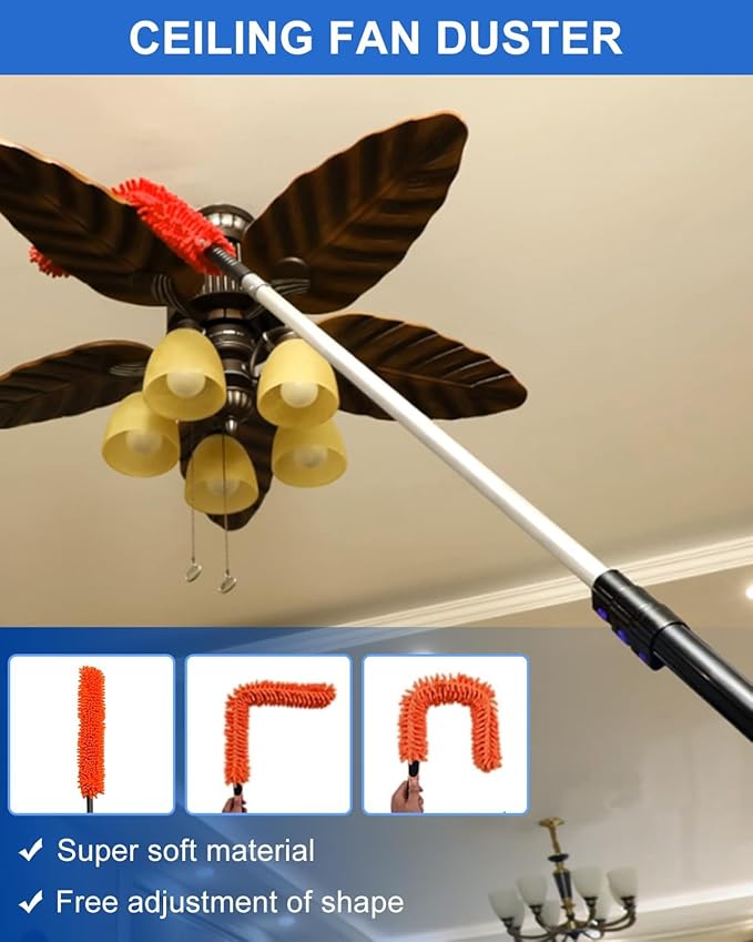 - Universal Joint & Bendable Microfiber Fan Duster - The universal joint can connect various dust removal brush heads and adjust the angle freely as needed. The long fibers on the duster make it the perfect tool for dust removal. The microfiber feather duster has a slight positive charge and can easily absorb hair and dust. The duster has a built-in bendable metal rod that can be bent to adapt to various strange angles and uneven surfaces. Soft feathers do not leave scratches and protect the surface.