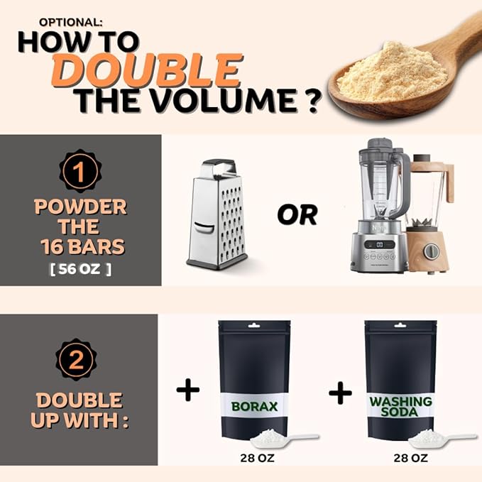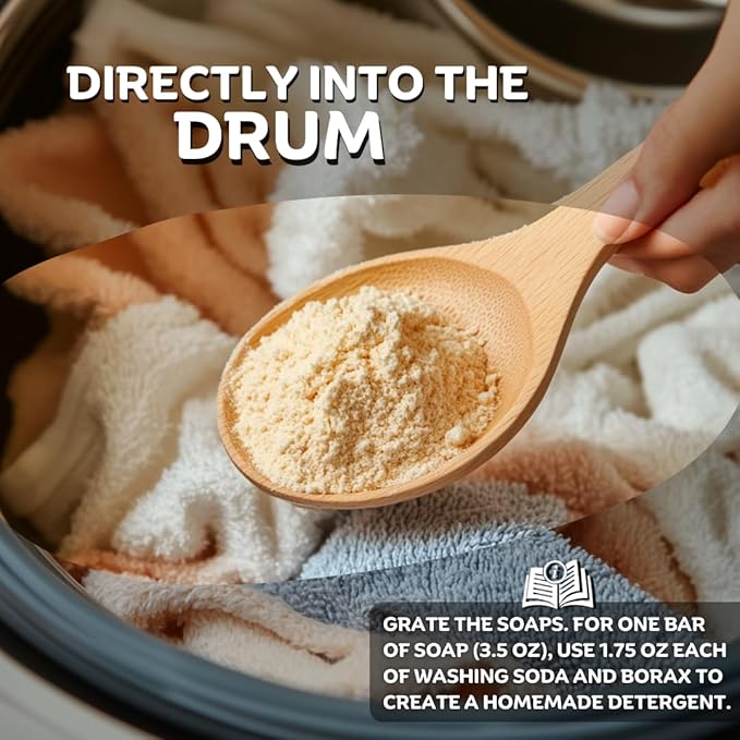 - Sort Of Use - 2: Laundry Detergent - Grate the soaps. For one bar of soap (3.5 oz), use 1.75 oz each of washing soda and borax to create a powerful homemade detergent. Mix well and add directly to the washing machine drum, bypassing the dispenser, for optimal cleaning efficiency.
