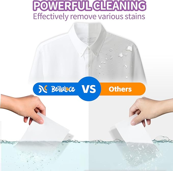 - QUICK DISSOLVE & POWERFUL CLEANING - Bellaluce laundry detergent sheets dissolves fully in seconds and work great in hot or cold water; with safe ingredients, dissolving and removing various stains like red wine, oil, lipstick, coffee, mud and sweat, and leaving your clothes fresh and clean (Tip: If your clothes are very dirty, please soak the clothes with sheets for 15-30 minutes before washing.)